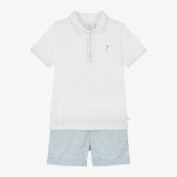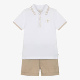 A delightful white and beige cotton shorts ensemble for boys by Caramelo Kids features a soft piqué polo shirt adorned with elegant striped ribbed trims and discreet button fastenings. The gold logo embroidery adds a touch of sophistication. Paired with classic beige twill shorts, designed with smart turn-ups and secure button and zip fastenings, this outfit is perfect for stylish spring and summer outings. Limited quantities available, making it a last-chance opportunity to enhance a wardrobe with this charming set.