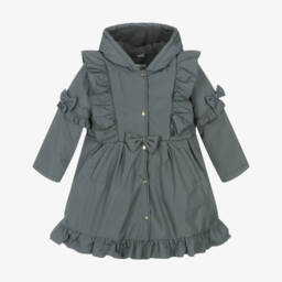 Pretty beige hooded coat for girls by British brand Caramelo Kids. Made in soft, smooth fabric, with a stylish A-line shape, it has a quilted design with faux pearls decorating the front. There is a white satin bow trim on the chest with a white logo charm. It is lined in super soft teddy fleece for extra warmth and has a silver zip fastening on the front.