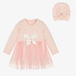Girls ivory knitted dress set by Caramelo Kids features a super soft cotton bodice adorned with silver diamantés and a pink satin bow. The tulle skirt, lined with soft cotton voile, adds volume and comfort. It comes with a matching ivory knitted turban, complete with a bow and silver diamantés. Last chance to buy this elegant set, perfect for special occasions.