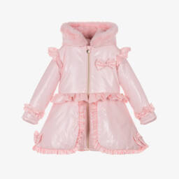 Lovely white coat for girls by Caramelo Kids, made in a silky smooth fabric with a lovely sheen. This gorgeous coat is lightly padded and lined with super soft sherpa fleece, with an ivory faux fur hood trim for an extra cosy feel. There is a fixed elasticated belt on the waist with decorative bows on the front. Ruffles over the shoulders and on the hem give a pretty, girly finish. It has concealed side seam pockets and fastens at the front with a zip with a gold heart logo pull tab.