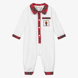 Charming off-white romper for baby boys by Caramelo Kids, with red cotton tartan check trims. Made in soft cotton jersey, it has a smocked and embroidered nutcracker appliqué on the patch pocket.