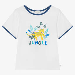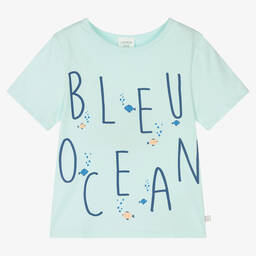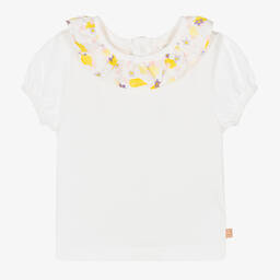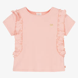 Pale pink soft organic cotton T-shirt for little girls by Carrément Beau, with little capped sleeves. It has a white frilled collar with a print of a shiny rose gold heart with the word 'Pretty' in French. There are useful popper fastenings on the back.