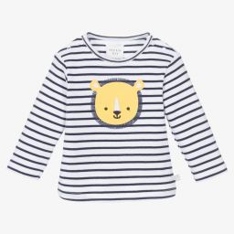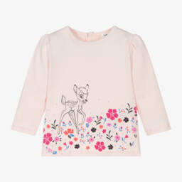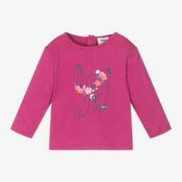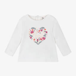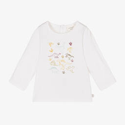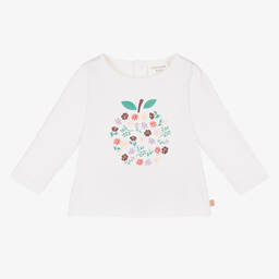 Little girls white long sleeve top by Carrément Beau, made in soft organic cotton jersey. It has an 'Adorable' brown squirrel print on the front, with white and green flowers, and a sparkly rose gold logo tab on the side seam. It fastens easily with poppers on the back.