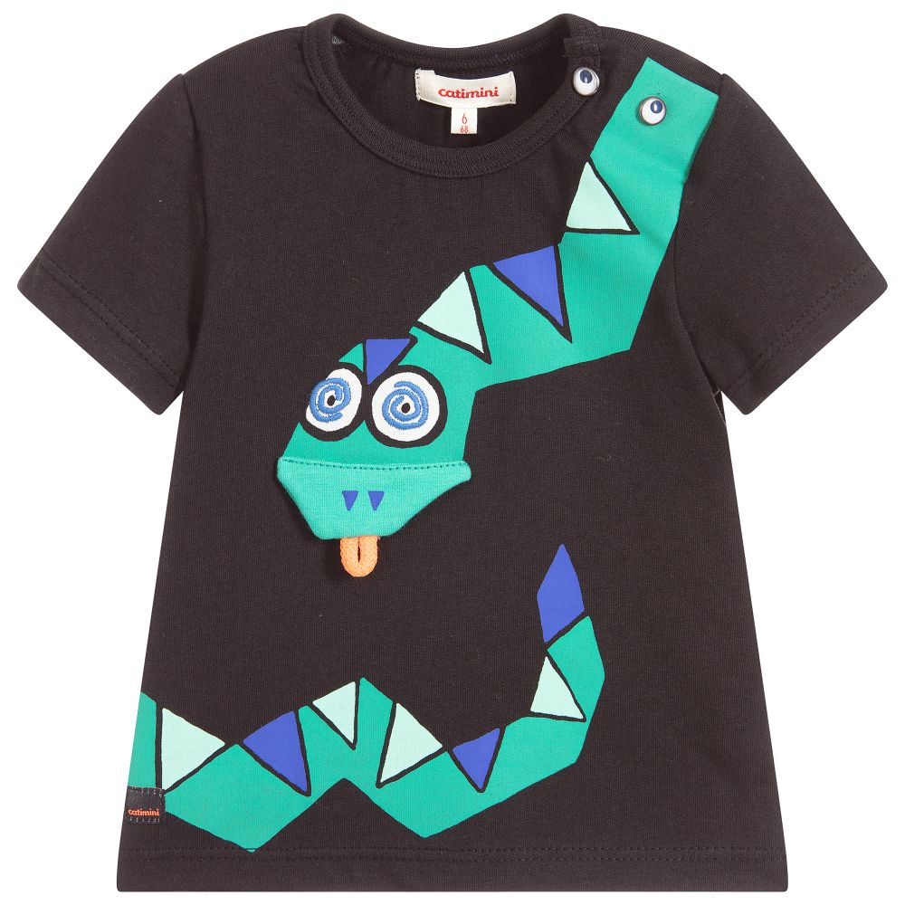 Younger boys black cotton T-shirt with a fun green snake motif by Catimini. Made from soft cotton jersey, it has cute eye shaped popper fastenings on one shoulder.