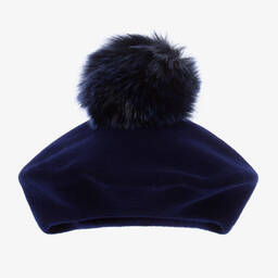 Girls burgundy red beret by Italian brand Catya, made in soft felted Merino wool. A timeless way to finish an outfit, this structured beret has a traditional silhouette with a large red faux fur pom-pom on the top.