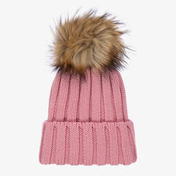 Green hat for girls by Italian brand Catya, made in Merino wool with a chunky ribbed knit. It has a fixed turn-up brim and a large beige faux fur pom-pom on top.