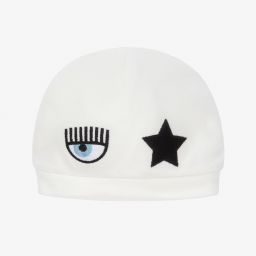 Pink layette hat for baby girls, by Chiara Ferragni Kids. Made from soft cotton jersey, it has a fun Eyelike logo and embroidered star appliqué on the front.