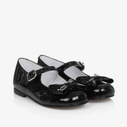 A pair of smart gold leather shoes for girls by Children's Classics. Detailed with bows and sparkly diamanté buckles, they are made and lined in soft leather with buckle fastening straps. The inner sole and lining are slightly discoloured and the outer soles show some light previous wear.