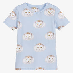 Pale pink short sleeve t-shirt in soft stretch cotton with all-over white Tudor cat print.