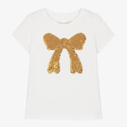 Eye-catching ivory cotton T-shirt for girls by Childrensalon Occasions, just right to add a special touch to an outfit. Made in soft, comfortable jersey, it has a pretty pink sequinned bow on the front, that shimmers in the light.
