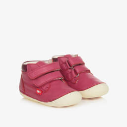 Deep pink first-walker boots for girls by Chipmunks, made in soft leather. Fastening with easy-to-use velcro, these comfortable shoes have a faux leather lining and insole. The rubberised sole is flexible and treaded with a paw print, just right for those first little steps.