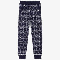 Beige and white Mini-me joggers for girls by luxury French designer Chloé. They are knitted in a soft cotton and wool blend, with the brand's jacquard 'C' logo pattern. They have side pockets, and the elasticated waistband has a faux drawstring detail.