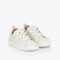 Navy blue leather trainers for girls by Chloé, with lace fastenings. The signature Chloé logo is printed on the side and embossed on the tongue. They are lined in shearling for added warmth and comfort. The non-slip rubber outer soles improve grip when walking and have small scalloped details adding a quirky finish to a classic style.