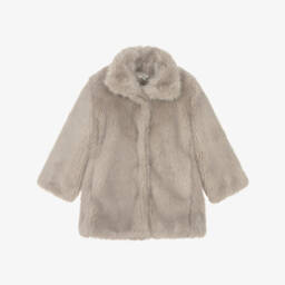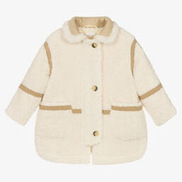 Light brown cotton twill coat for girls by Chloé, in the style of a Canadian army coat with a faux fur collar. Warmly padded, this Mini-me style has a pink satin jacquard lining, patterned with the brand's arabesque 'C' logo. The coat has a detachable hood, front pockets, engraved horn buttons and branded zip closure. It comes with an adjustable, detachable belt.