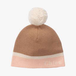 Navy blue organic cotton and wool hat from luxury label Chloé, made in a super-soft and cosy knit. Striped in ivory and beige, this lovely design is enhanced by an intarsia signature logo and a fluffy grey pom-pom on the top.