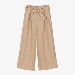 Girls navy blue linen trousers by Chloé, crafted from cool linen for warmer days. These wide-legged trousers feature a fabric sash tie on the waist with large gold-tone eyelets, adding a signature touch. Stylish inverted pleats and front pockets enhance the look, while an elasticated back panel ensures a neat fit. Complete with an embroidered logo at the back, these trousers are perfect for chic summer outings. Limited quantities available, last chance to buy.