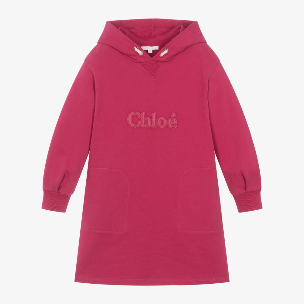 Girls pink hooded dress by Chloé is crafted from soft organic cotton jersey, offering a cosy and stylish look. Featuring ribbed cuffs and handy side pockets, it blends comfort with practicality. The embroidered logo on the front adds a subtle designer touch. Suitable for autumn and winter, this dress provides warmth and ease for everyday wear. Limited quantities available, ensuring a unique addition to any wardrobe.