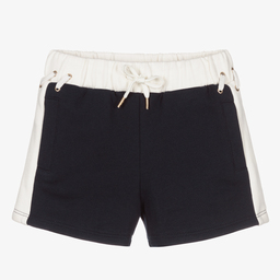 Girls pale pink shorts by luxury French designer Chloé, made in soft loop back organic cotton jersey. They have an ivory elasticated, drawstring waistband, trimmed with white lacing details with gold metal eyelets. There are ivory stripes down the side and the brand's signature logo is embroidered on the back. They have useful side pockets.