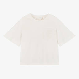 A white cropped T-shirt for girls by Chloé, inspired by the adult collection, offers a chic and relaxed style. Crafted from soft organic cotton jersey, this top features a bold, oversized logo across the front and a comfortable boxy fit with short sleeves. Perfect for casual spring and summer outings, it pairs effortlessly with jeans or skirts. Limited quantities available, making it a special addition to any wardrobe.