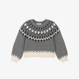 Beige jumper for teen girls by French designer, Chloé, as seen in the main collection. Made in a luxurious cotton and wool blend, it has a jacquard design in pink, dark beige and glittering gold yarn with 'C' monogram detailing. The Chloé signature logo is embroidered near the hem in tonal beige.