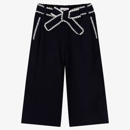 Super stylish navy blue Mini-me trousers for teen girls by luxury French designer Chloé, with wide legs. Made in a linen and cotton twill blend, they have pretty, embroidered ivory Guipure lace trims on the attached front sash and jetted pockets. The waistband is elasticated around the back for a comfortable fit and has a subtly embroidered logo on one side.