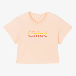 Teen girls white T-shirt from luxury designer Chloé, made in soft organic cotton jersey. This boxy-fit top is super stylish, with the French label's signature logo print in a blue and white gradient design on the front.