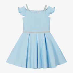 Made in England by David Charles who has dressed Royalty and celebrities, this pretty blue dress has gorgeous blue and green embroidered flowers. The layers of tulle and satin give the skirt a stunning full and voluminous flare. Adding to the feminine charm, it has delicate ruffles and a bow.