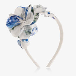 A pretty white and pink floral hairband for girls by David Charles. A lovely finishing touch to an outfit, the band is covered in white grosgrain ribbon and adorned across the top with white and blue floral appliqué, crafted in satin fabric and decorated with beads and faux pearls.