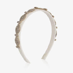 Timelessly elegant pale pink hairband for girls from British designer David Charles. Wrapped with grosgrain ribbon, the flexible band is decorated with rows of beautiful silver crystal embellishments set in gold metal.
