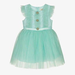 Girls stunning violet purple dress by British designer, David Charles. A lovely dress for parties and special occasions, it has a tulle overlay sprinkled with gold glitter for a sparkly effect. The fitted bodice has ruffle trims and three jewelled decorative buttons. There is a removable grosgrain ribbon belt that ties in a bow on the back. The full and flared skirt has tulle underskirts for volume and it is fully lined for comfort, with a concealed zip on the back.