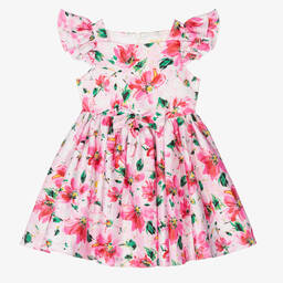 Gorgeous white and blue dress for girls by British designer David Charles. Crafted in beautifully soft satin, the fabric is patterned with stunning rose and leaf prints in blue and green. A square neckline, ruffled flutter sleeves and blue gem-encrusted bow on the waist add timeless elegance to this lovely piece. Silky and comfortable, the lining has a stiff tulle overlay for added volume. It fastens with a hidden zip on the back for a neat look.