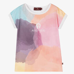 Girls very cool brightly coloured, jewel print T-shirt by Desigual with pretty gems and sequins and a contrasting grey patterned back. In a twist on the classic T-shirt, it has turn-up on the sleeve and ties with a cute knot on the front.