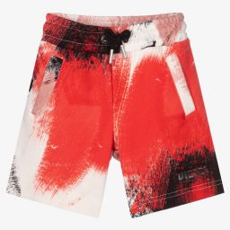 Tonal blue cotton jersey shorts for boys and girls by Diesel, with a graphic black and white brushstroke design. They have a drawstring waist, three pockets and a black logo print on the front.