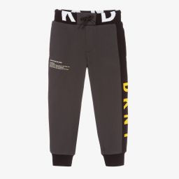 Navy blue joggers for boys by DKNY, made in soft, mid-weight sweatshirt jersey. They have a black and white logo stripe on one leg and useful side seam pockets. The stretchy drawstring waistband is ribbed and has matching branding. There is a creative brand statement print on one leg.