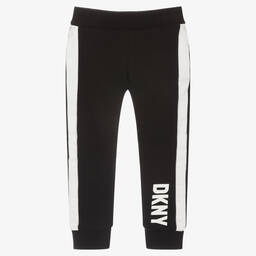Blue cotton joggers for boys by American brand DKNY, made from a mid-weight cotton jersey blend. Sporty in style, they have a black logo print on one leg and yellow and khaki green coated trims on the sides of the legs. They have concealed side pockets and an elasticated waist for comfortable wear.