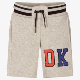Blue jersey shorts for boys by DKNY, made in mid-weight cotton. With a colourful embroidered logo on the front and back of one leg, they have a black and white striped waistband trim. They have three pockets and a drawstring waist fastening.