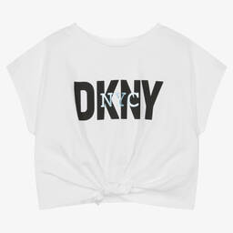 A black T-shirt for girls by DKNY, made in soft organic cotton jersey. Bold and distinctive, the pink logo print and white 'NYC' motif add contrast to this casual tee. It has a cool cropped fit, with a tie knotted hem.