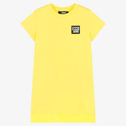 Casual and comfy, this white T-shirt dress for girls is by DKNY. Made in soft organic cotton jersey, it has a black and white rubberised logo patch on the chest and a tulle hem.