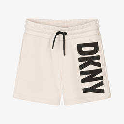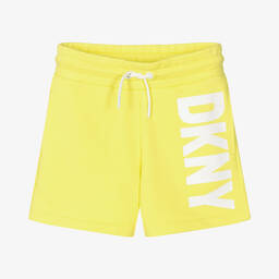 Black shorts for teen girls by DKNY, with a bold white logo print on one leg. Made in a soft cotton blend jersey, they are detailed with a drawstring waistband and useful side seam pockets, making them a comfortable choice for casual days.