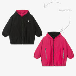 Black and lime green hooded windbreaker coat for teen girls by DKNY, in a versatile, reversible design. Made in silky smooth and lightweight fabric, the black side has exposed white zip pockets on the front and a silver iridescent logo print on the back. The reverse yellow side has a square black and white rubberised logo patch on the chest with a large statement logo graphic on the back. Oversized and wide-fitting with wide dropped sleeves and a zip front, the coat is finished with split side seams that fasten with branded popper fastenings.