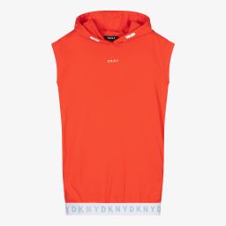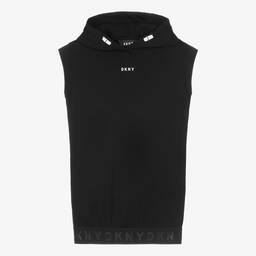 Yellow cotton jersey dress for teen girls by DKNY with a black and gold logo trim hem. Lightweight, this sporty dress has a small gold logo print on the front and a jersey lined hood. There are fixed black ties around the neck, and side seam pockets.