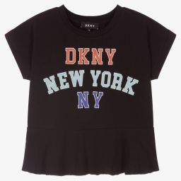 White cotton T-shirt for teen girls, from American brand DKNY, in a slightly cropped boxy shape. With a fun frilled hem, it has a pink, purple and yellow New York logo, outlined in shiny gold on the front.