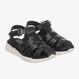 Brown leather sandals for boys by luxury brand Dolce & Gabbana. These Mini-me sandals have blue trims, a softly padded insole and a non-slip rubber sole. They have a buckle fastening strap.
