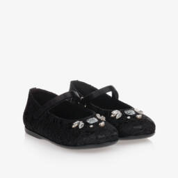Stunning black Mary Jane shoes for girls by luxury designer Dolce & Gabbana, with sparkly diamanté paved DG logo on the front. Combining elegantly timeless Italian styling and comfort, these bar shoes are made in sumptuous velvet with soft leather full lining and a buckle fastening strap. The little heels complement the feminine look and there are sturdy leather outsole with a rubber pad for improved grip.