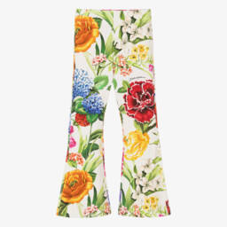 Lovely black and ivory Mini-me leggings for girls by luxury Italian brand Dolce & Gabbana. Made in soft and stretchy cotton jersey, they have a bold red and green anemone and rose print with an elasticated waistband.