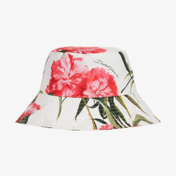 The girls white butterfly hat by Dolce & Gabbana is a charming accessory for the spring and summer season. Crafted from soft woven cotton, this delightful piece features a vibrant butterfly print and a playful frilled edge with a subtle brand script. Ideal for sunny days, it offers a stylish touch while providing comfort and protection. Limited quantities available, making it a last chance to buy this exquisite hat.