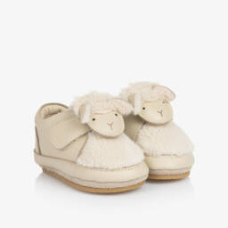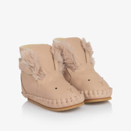 Lovely light beige shoes for baby girls by Donsje, with a lovely dark beige butterfly bow trim. Handmade and fully lined in soft leather, they fasten with T-bar velcro straps on the ankle. They have a suede leather outer sole on smaller sizes and a flexible rubber sole on larger sizes, perfect for taking those first steps.