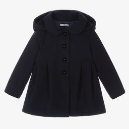 Lovely beige coat for girls by Dr. Kid, made in a soft felted fabric with a brushed wool feel. Traditionally styled, it has smart velvet covered button fastenings, a sweet bow on the back and soft pleats for a flared shape. The removable hood has a super soft faux fur lining and attaches with buttons under the collar.