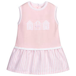 Lovely white dress and headband set for girls by Dr. Kid, made in lightweight cotton. Both pieces are patterned in a blue and red striped polka dot print. The dress has pretty tulip sleeves, with a grosgrain-trimmed bow detail on the front. The headband is elasticated at the back, with a matching red grosgrain trim.