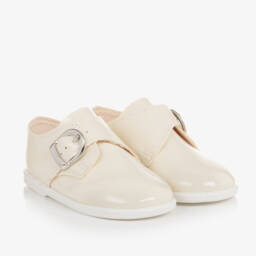 For little boys, these smart navy blue first-walker shoes are from British brand, Early Days. They are made in soft, flexible faux patent leather. There is an adjustable silver buckle on the side. They are lined in white fabric, lightly cushioned and the non-slip outer soles are made of soft, flexible black rubber.